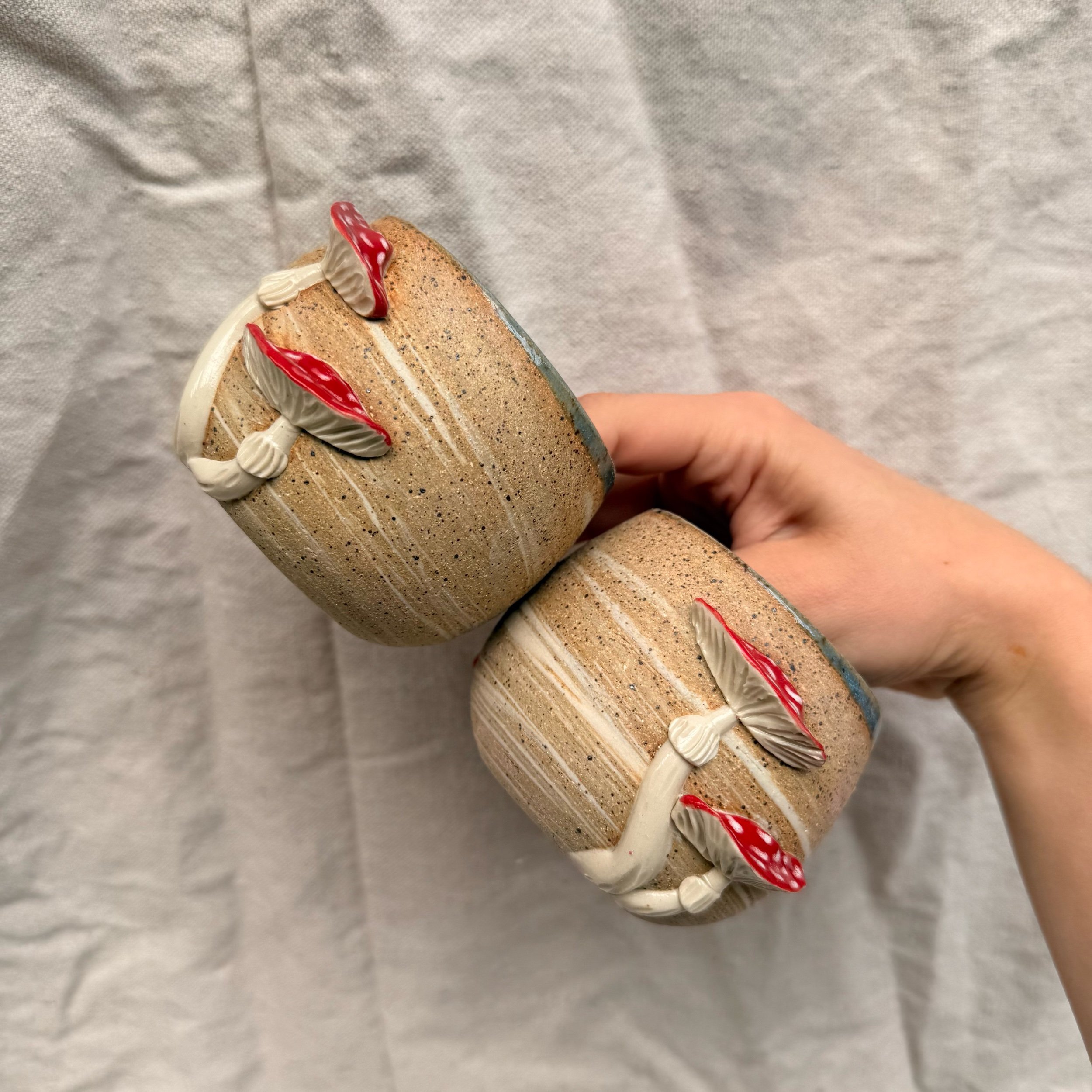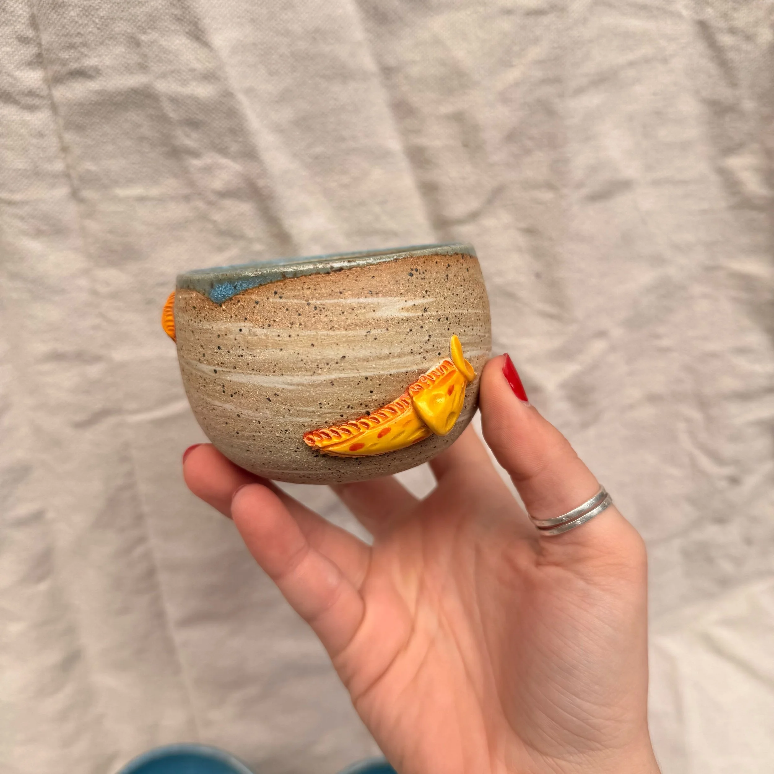 These little wine cups are made from all of my clay bodies mixed together! The inside and rim are glazed in blue, and the outside is raw, sanded down clay.