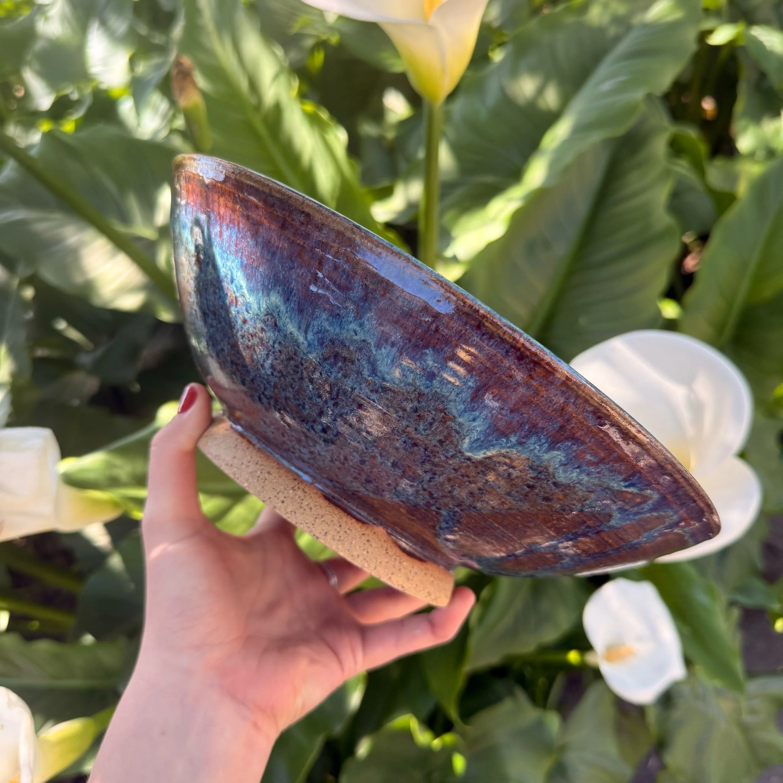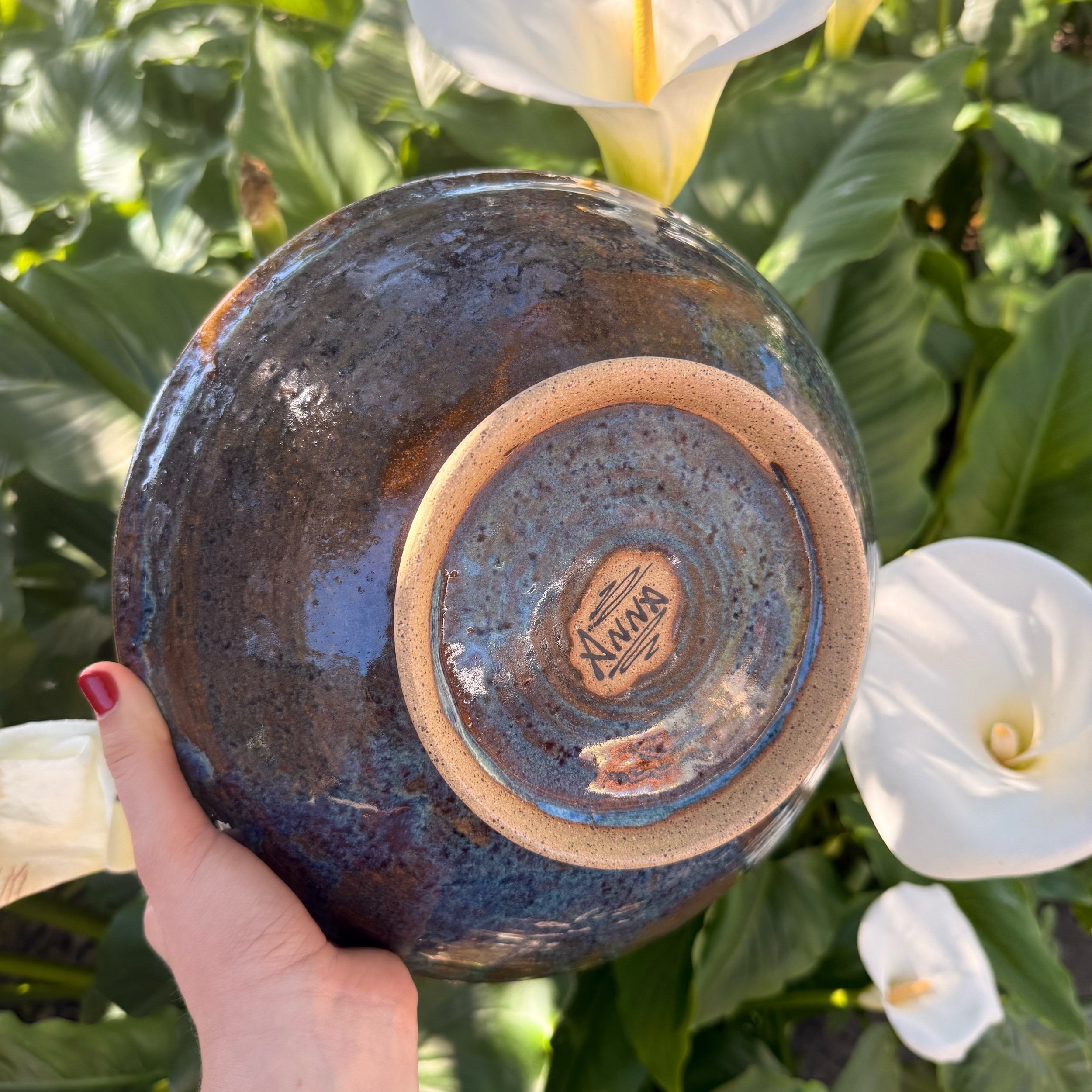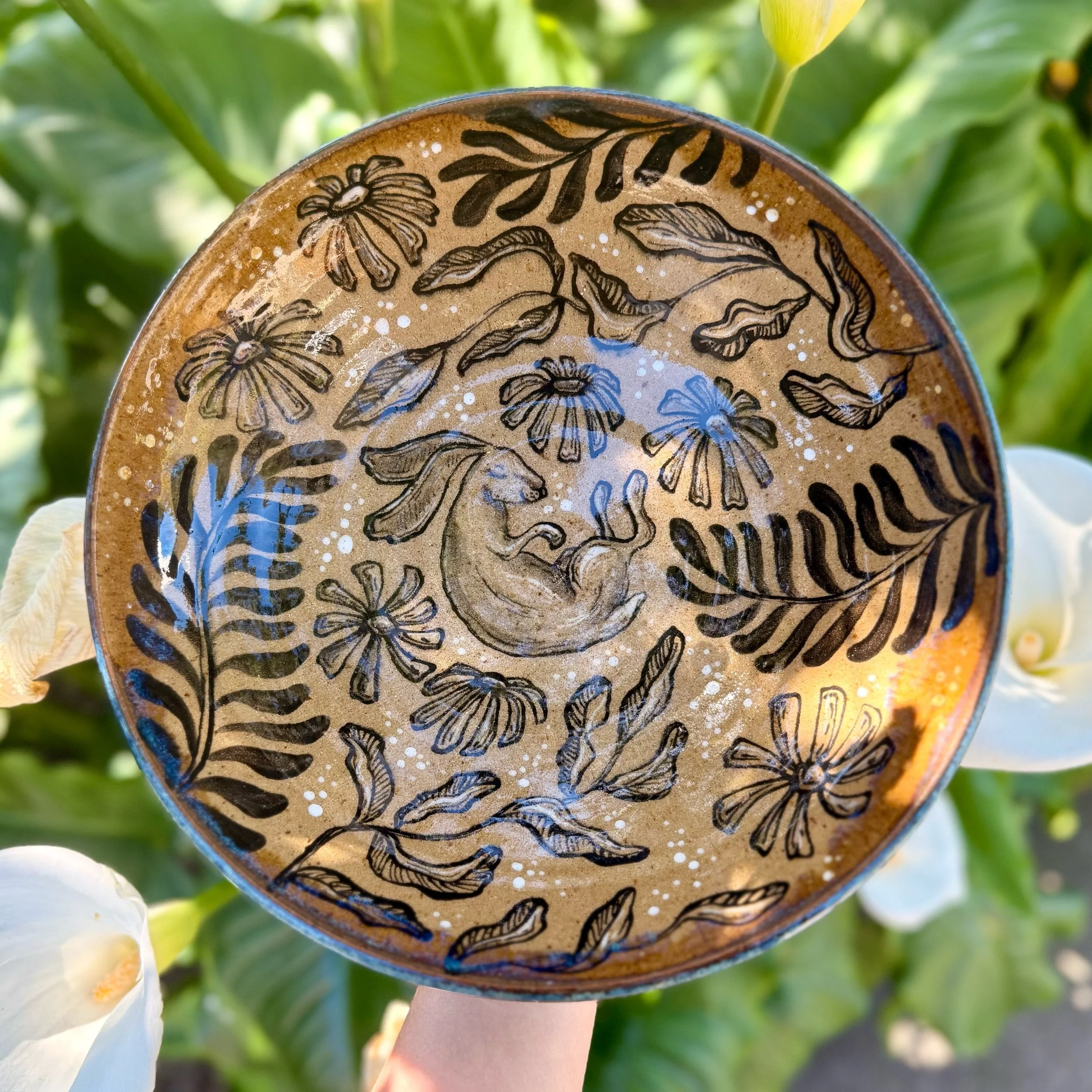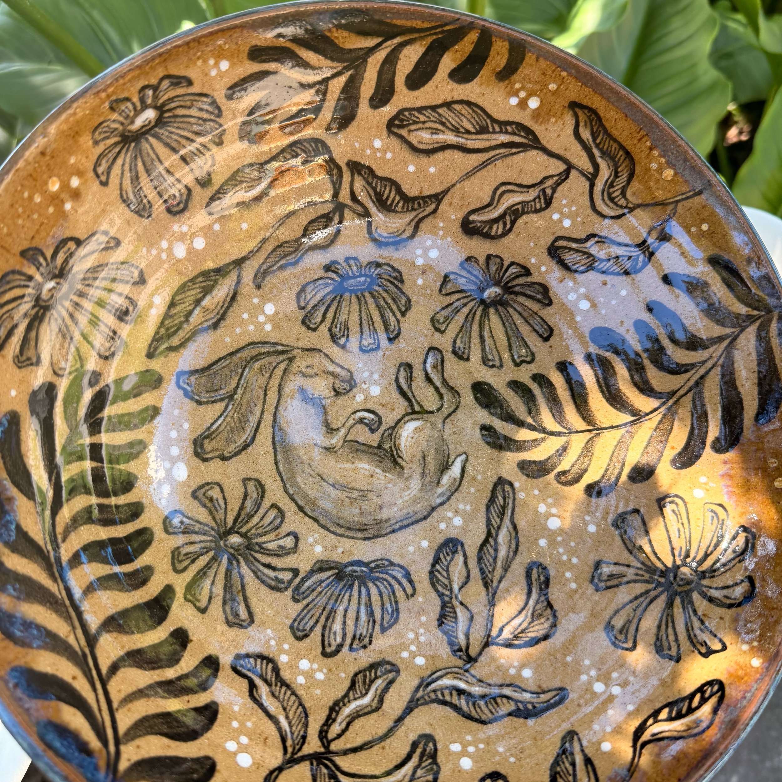 Wheel thrown, 10.5” bowl in speckled brown clay, hand painted with a rabbit and botanical motif. Microwave and dishwasher safe!