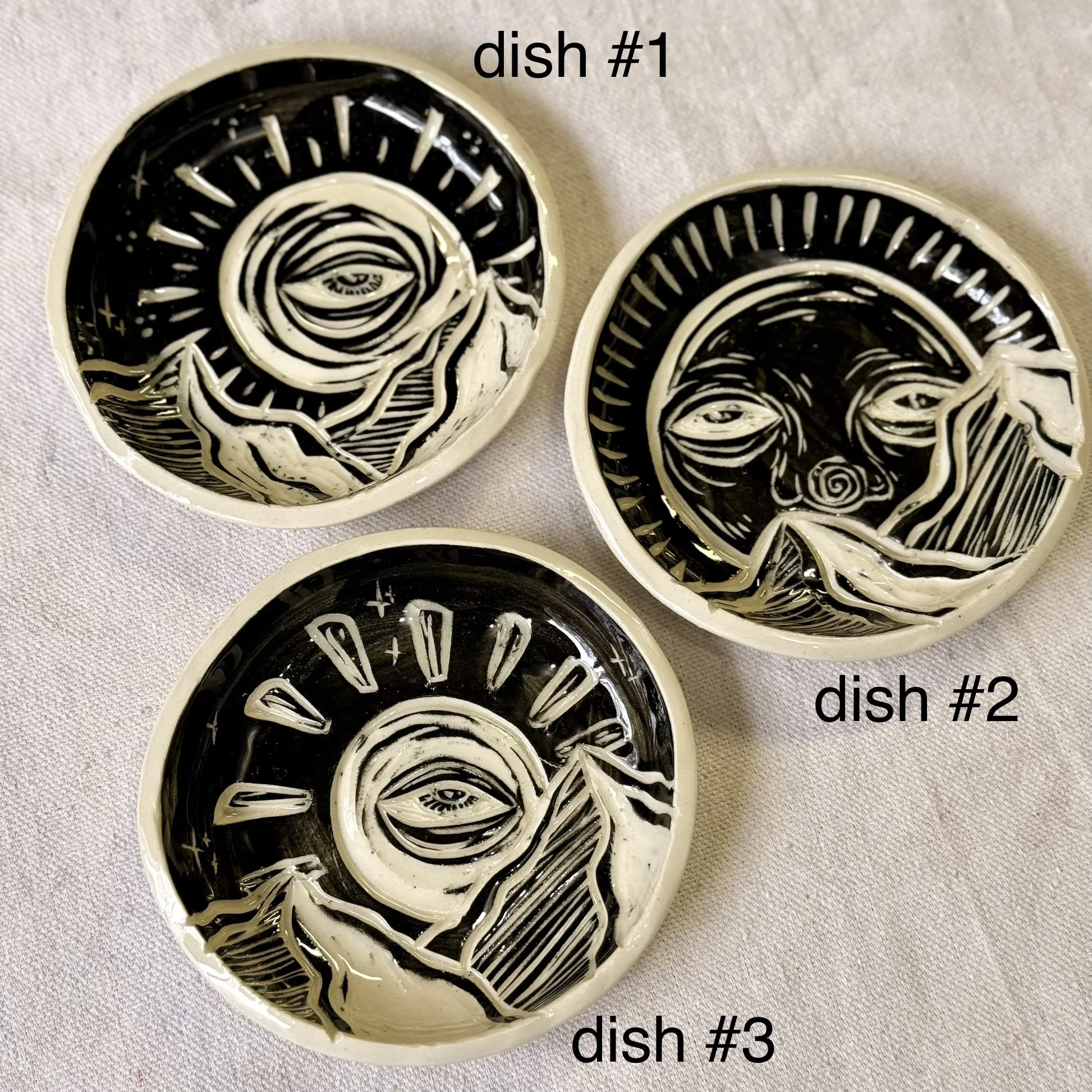 Shop › Sgraffito Trays Image 1 of 6 Image 2 of 6 Image 3 of 6 Image 4 of 6 Image 5 of 6 Image 6 of 6 Sgraffito Trays $25.00 sold out! These hand molded 4” trays are painted with black underglaze and carved by hand with these mountain sun motifs! design: tray #1 tray #2 tray #3 sold out! Added! These hand molded 4” trays are painted with black underglaze and carved by hand with these mountain sun motifs! Reviews Reviewer Name Review Date Star Rating Description Posted on Etsy Product Show More