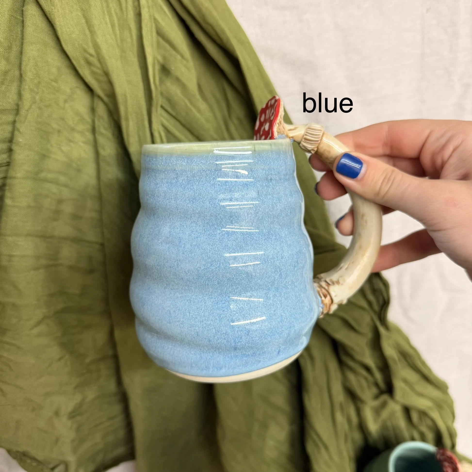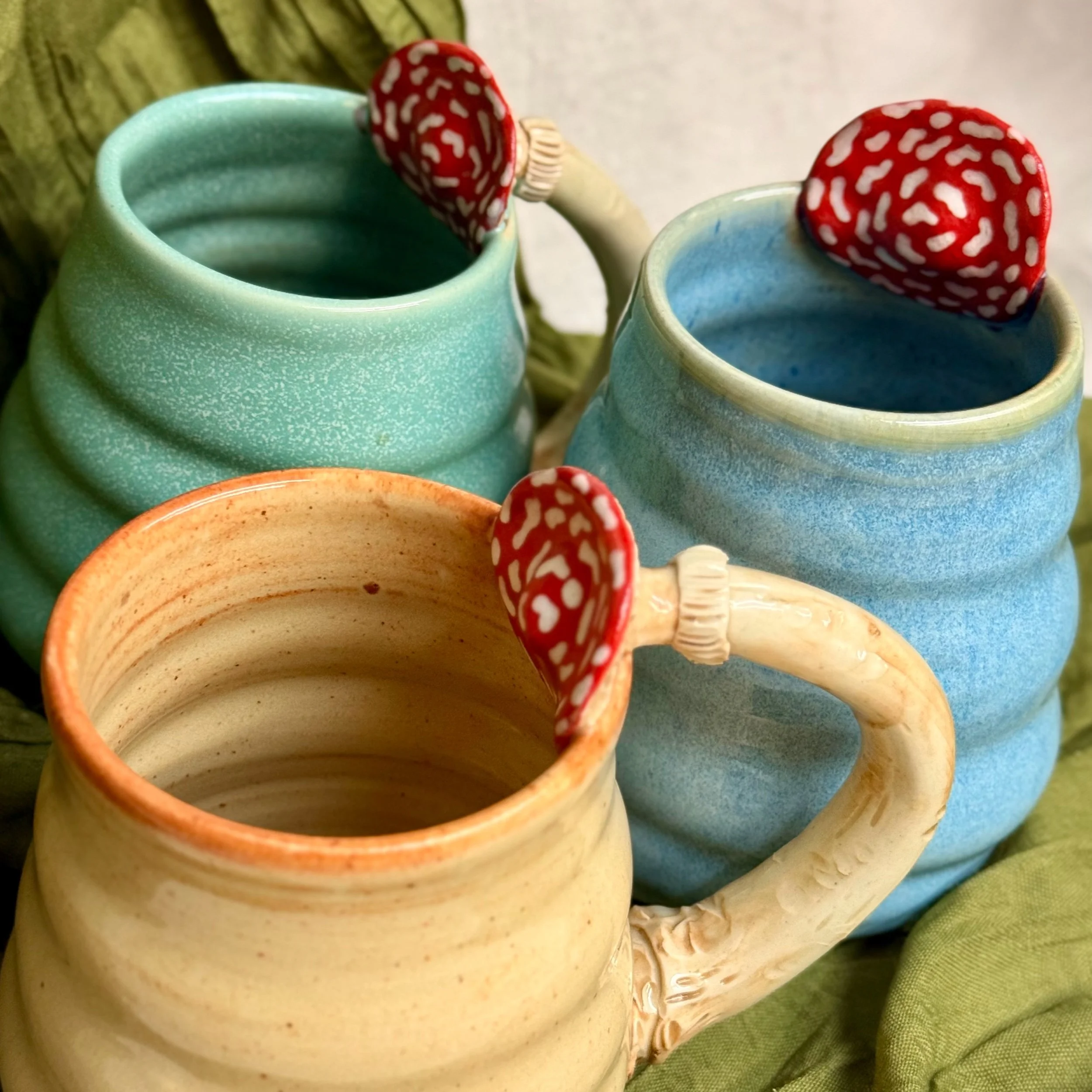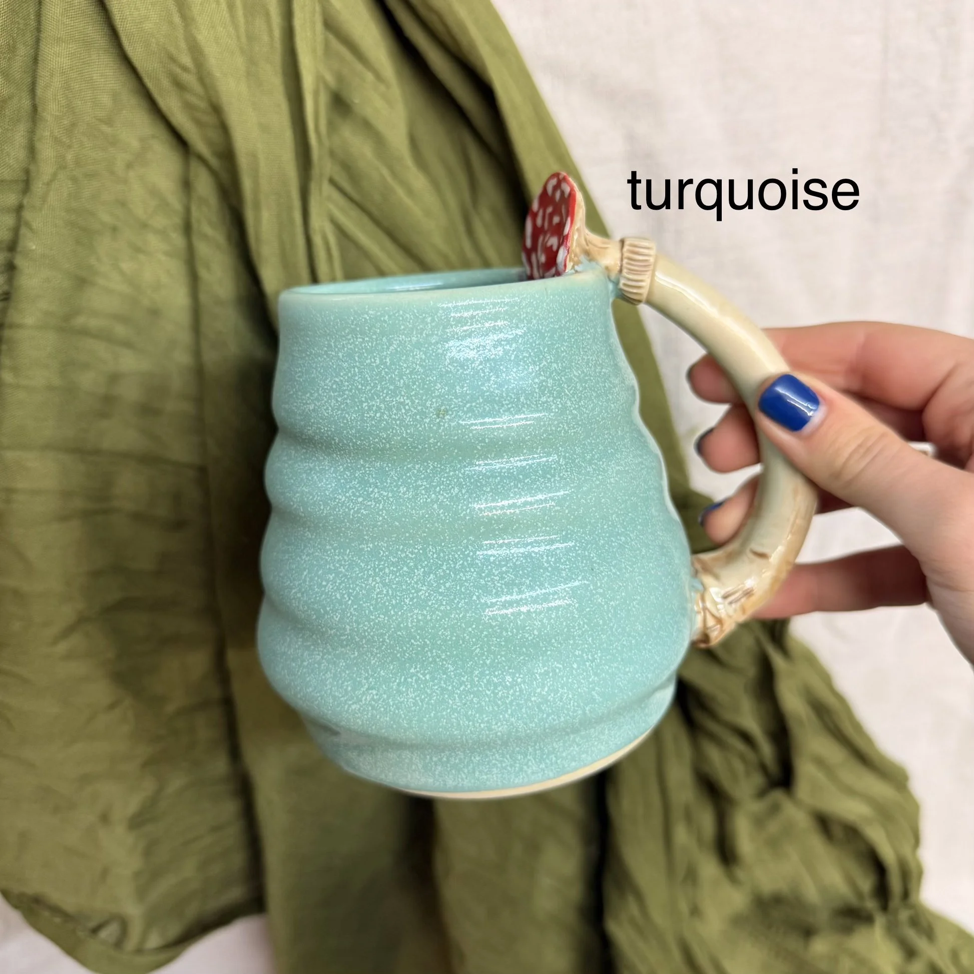 Shop › Mushroom Handle Mug Image 1 of 6 Image 2 of 6 Image 3 of 6 Image 4 of 6 Image 5 of 6 Image 6 of 6 Mushroom Handle Mug $60.00 sold out! These swirly mugs are hand sculpted with a mushroom handle! Microwave and dishwasher safe! glaze: shino light blue turquoise sold out! Added! These swirly mugs are hand sculpted with a mushroom handle! Microwave and dishwasher safe! Reviews Reviewer Name Review Date Star Rating Description Posted on Etsy Product Show More