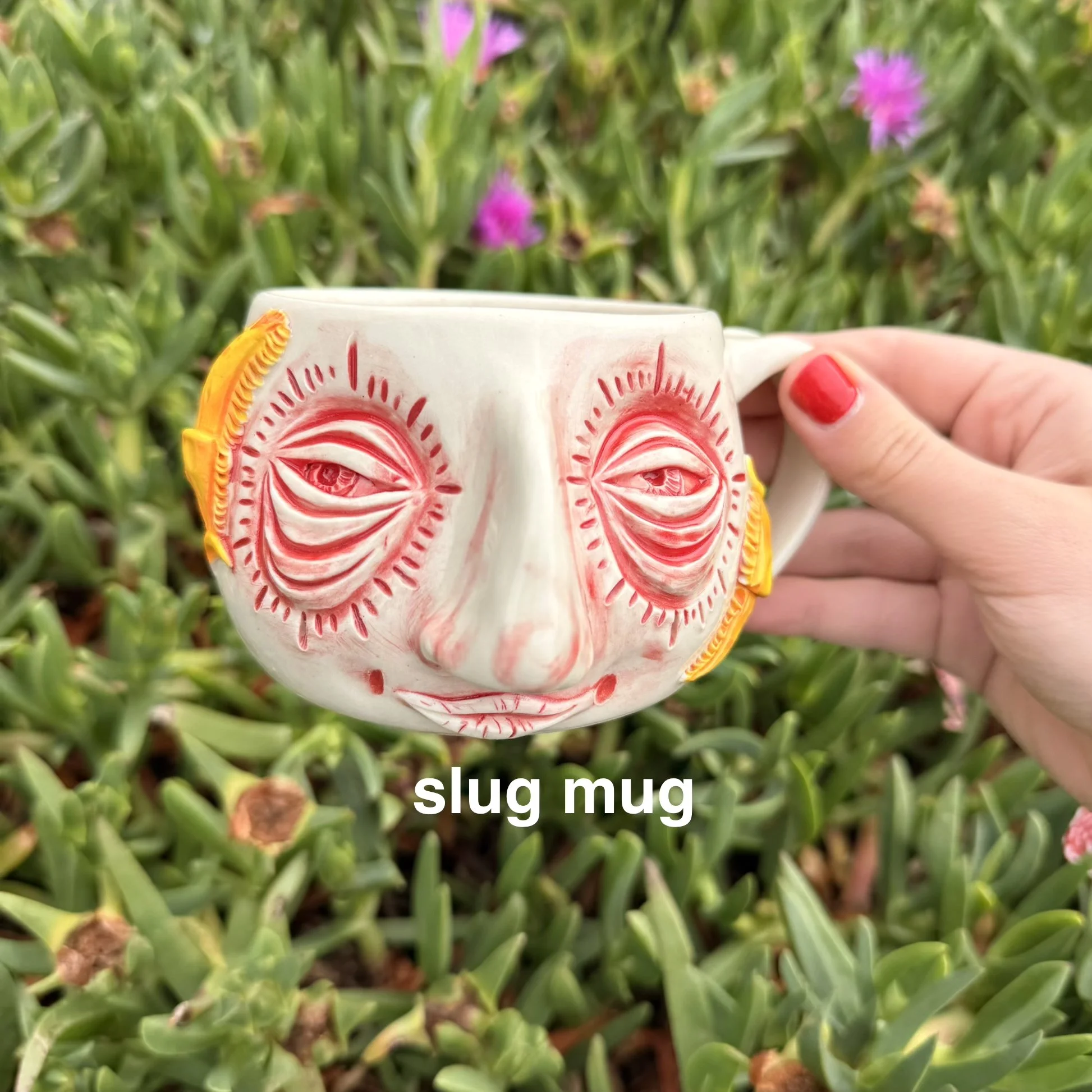 Wheel thrown mug, hand sculpted with a face! Microwave and dishwasher safe!