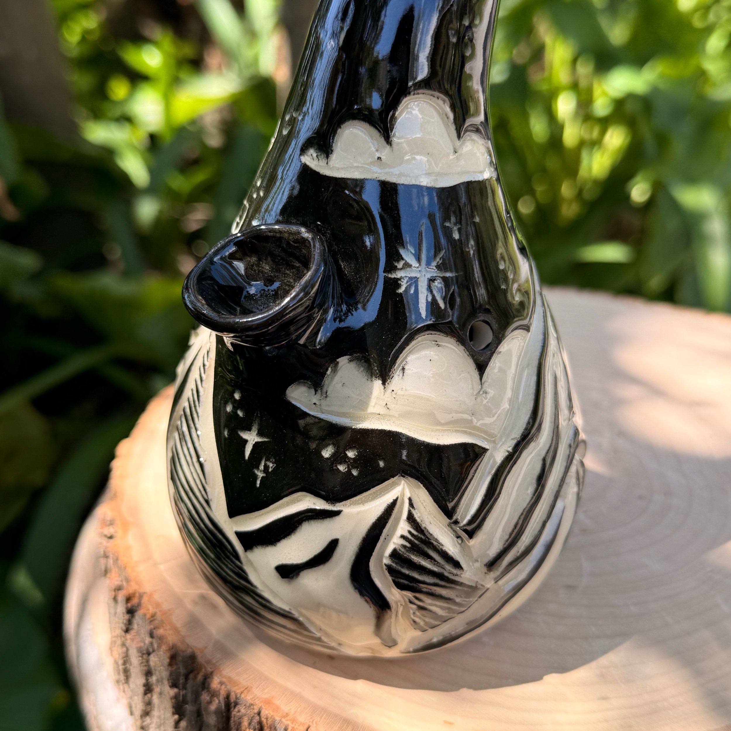 Wheel thrown bubbler with a built in down stem, so you can fill the piece with water, and a carb hole to clear the piece after using. Cleans up well with isopropyl alcohol and salt!