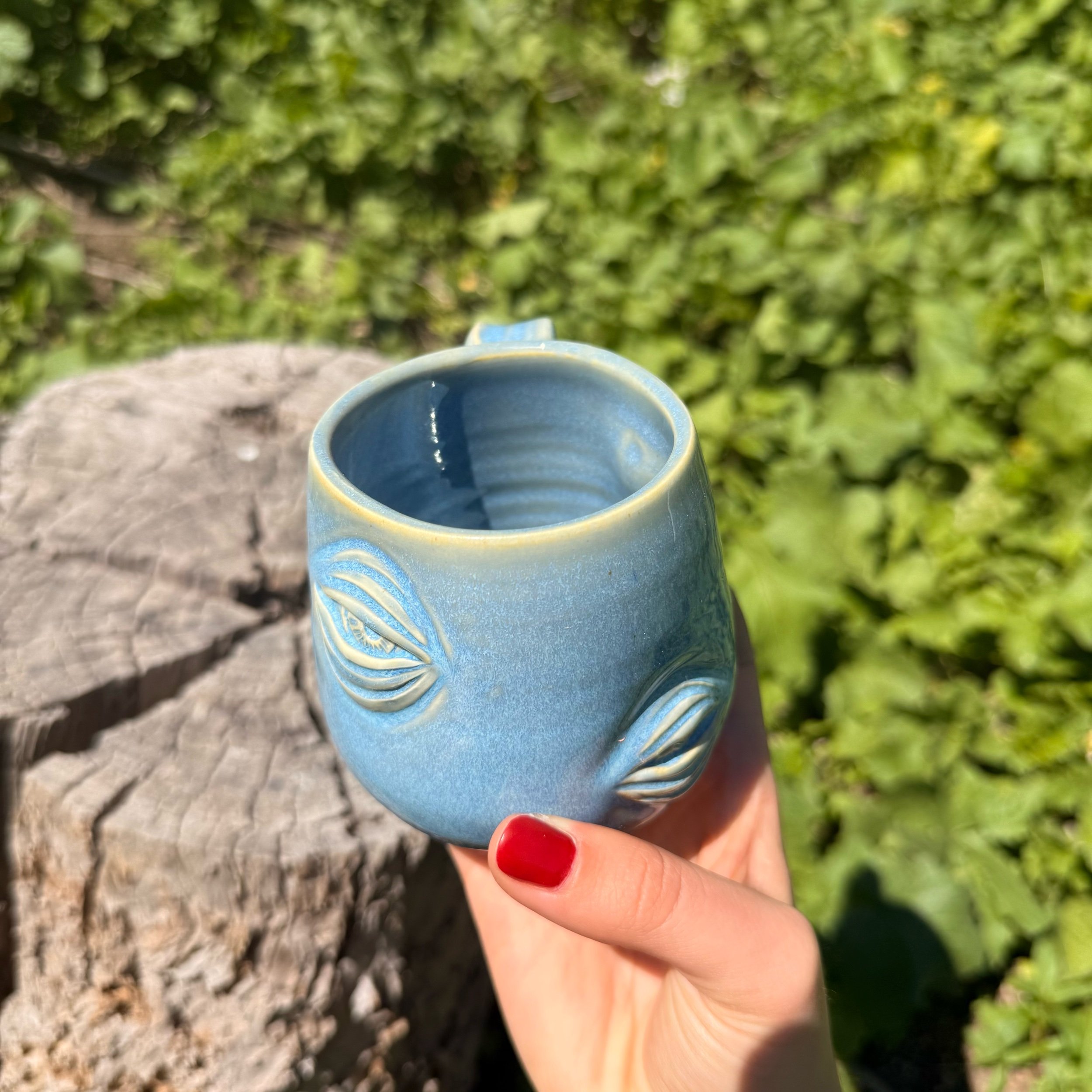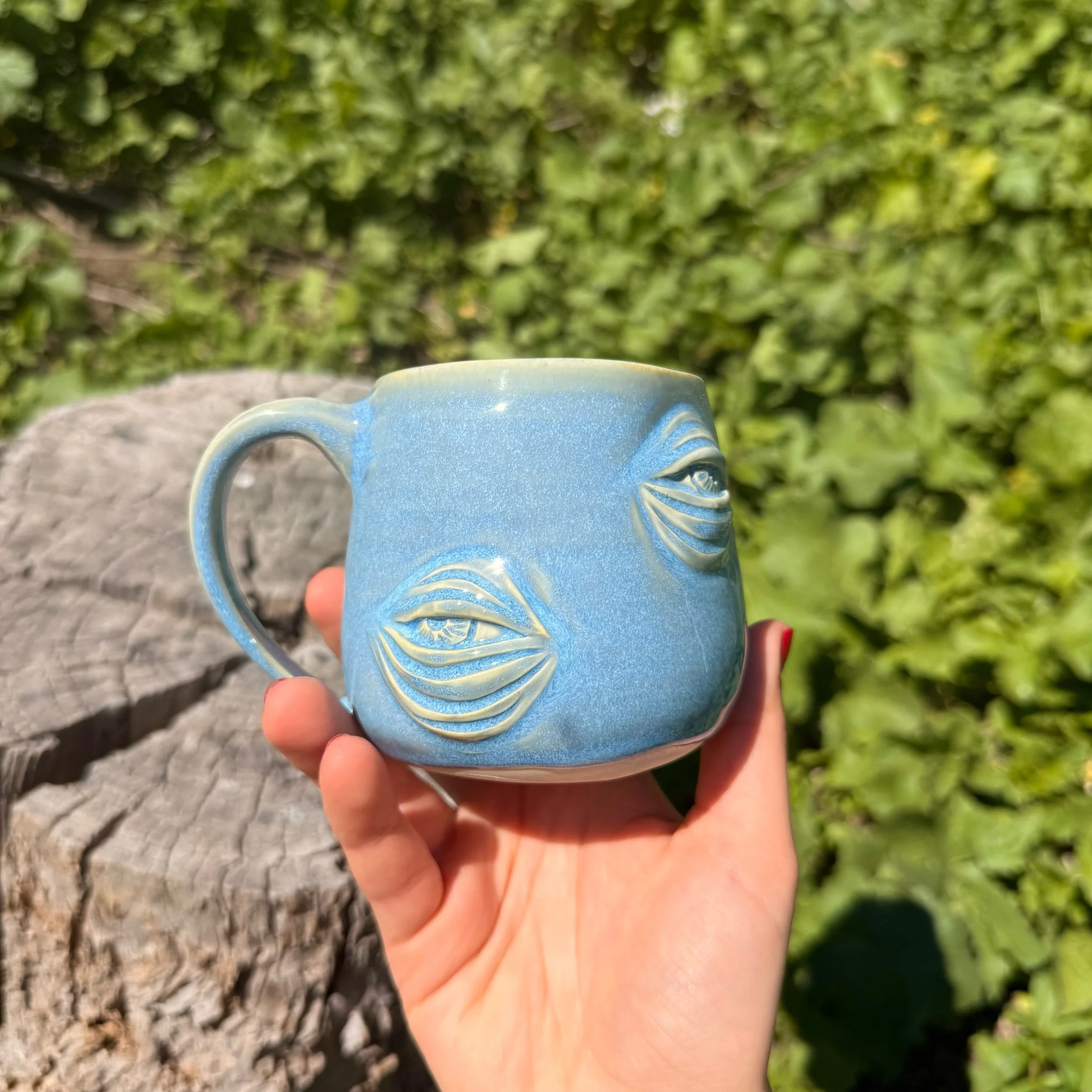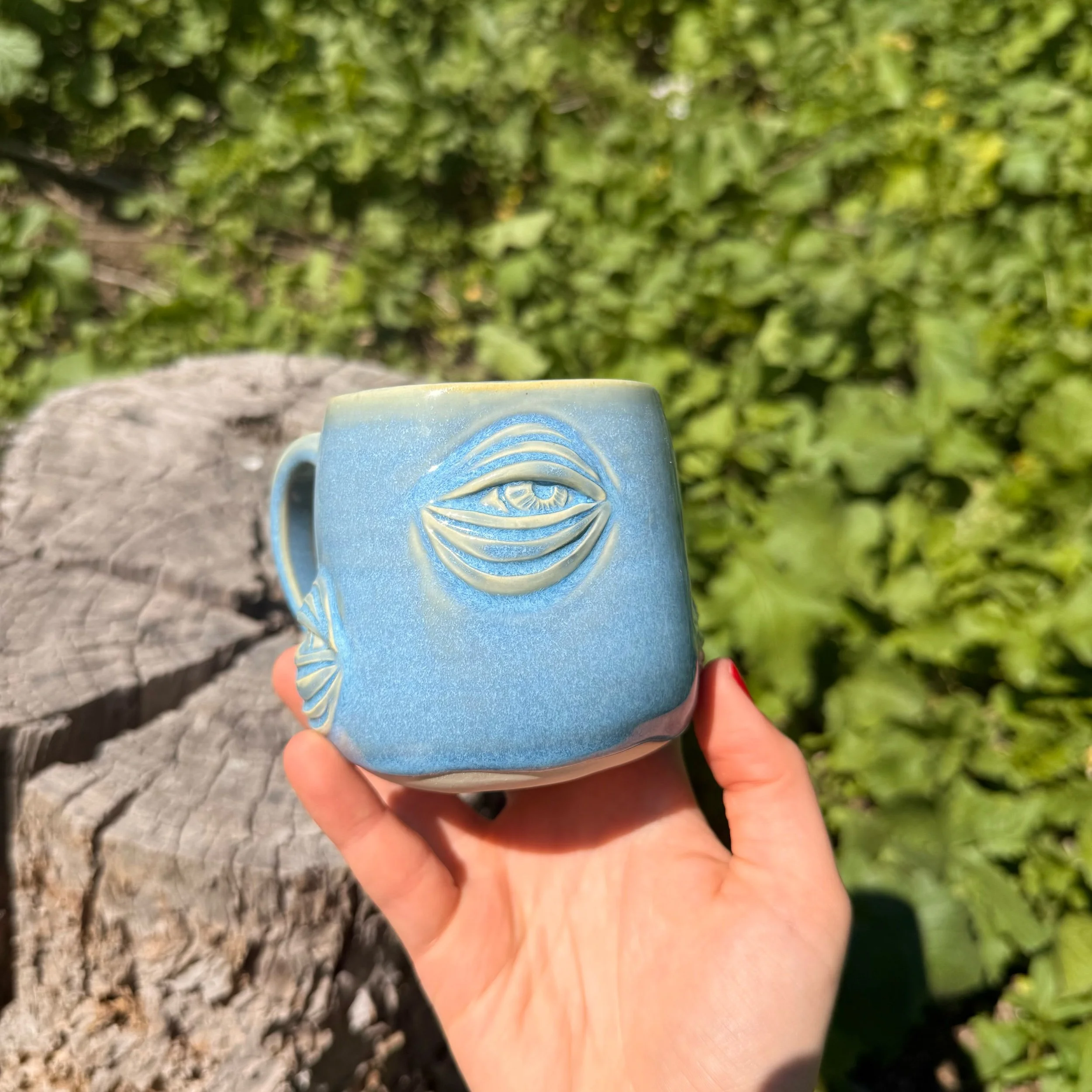 Shop › Eye Mug Image 1 of 5 Image 2 of 5 Image 3 of 5 Image 4 of 5 Image 5 of 5 Eye Mug $50.00 coming soon! Wheel thrown mug, altered by hand with eyes! Glazed in a lovely blue. Holds 10 ounces, microwave and dishwasher safe. coming soon! Added! Wheel thrown mug, altered by hand with eyes! Glazed in a lovely blue. Holds 10 ounces, microwave and dishwasher safe. Reviews Reviewer Name Review Date Star Rating Description Posted on Etsy Product Show More