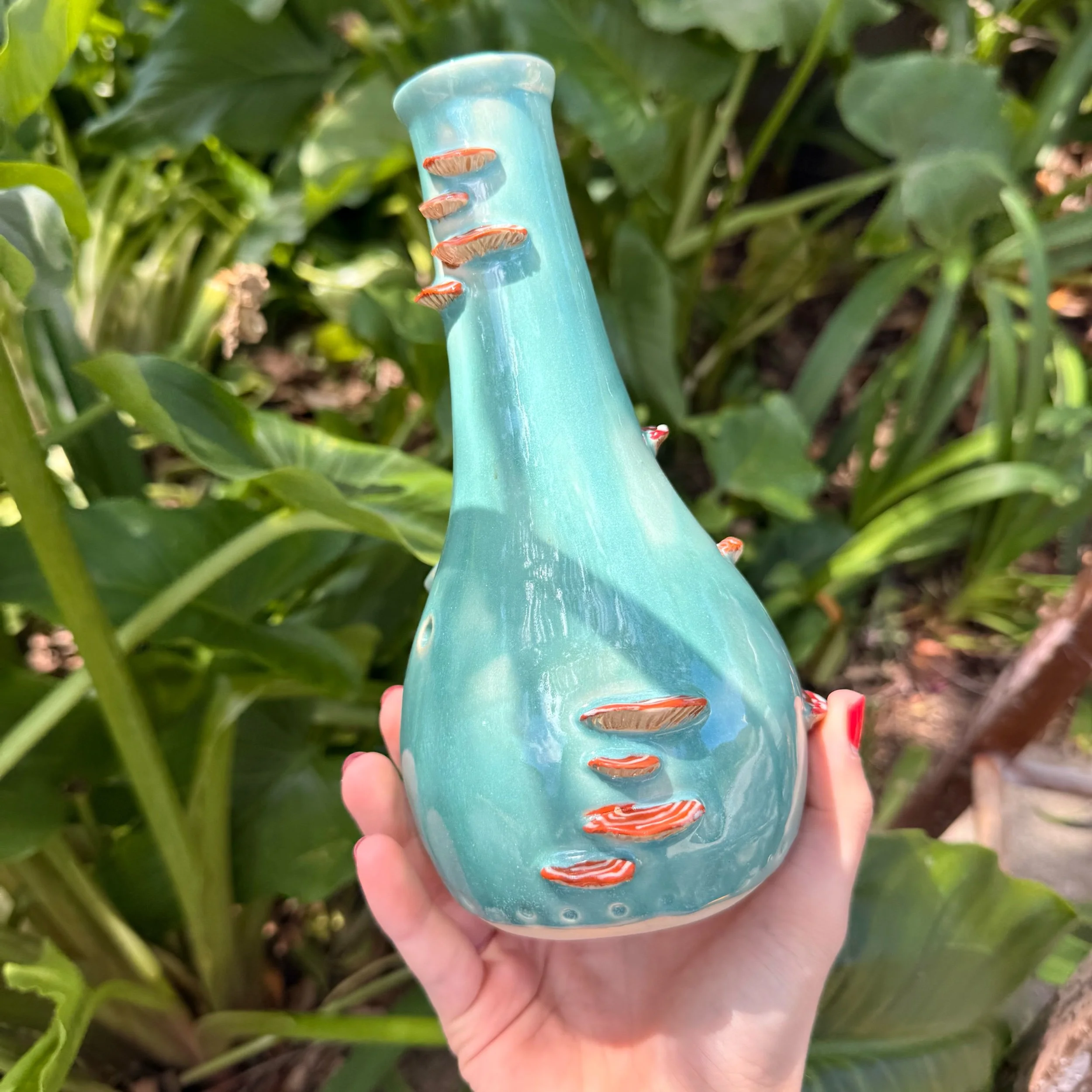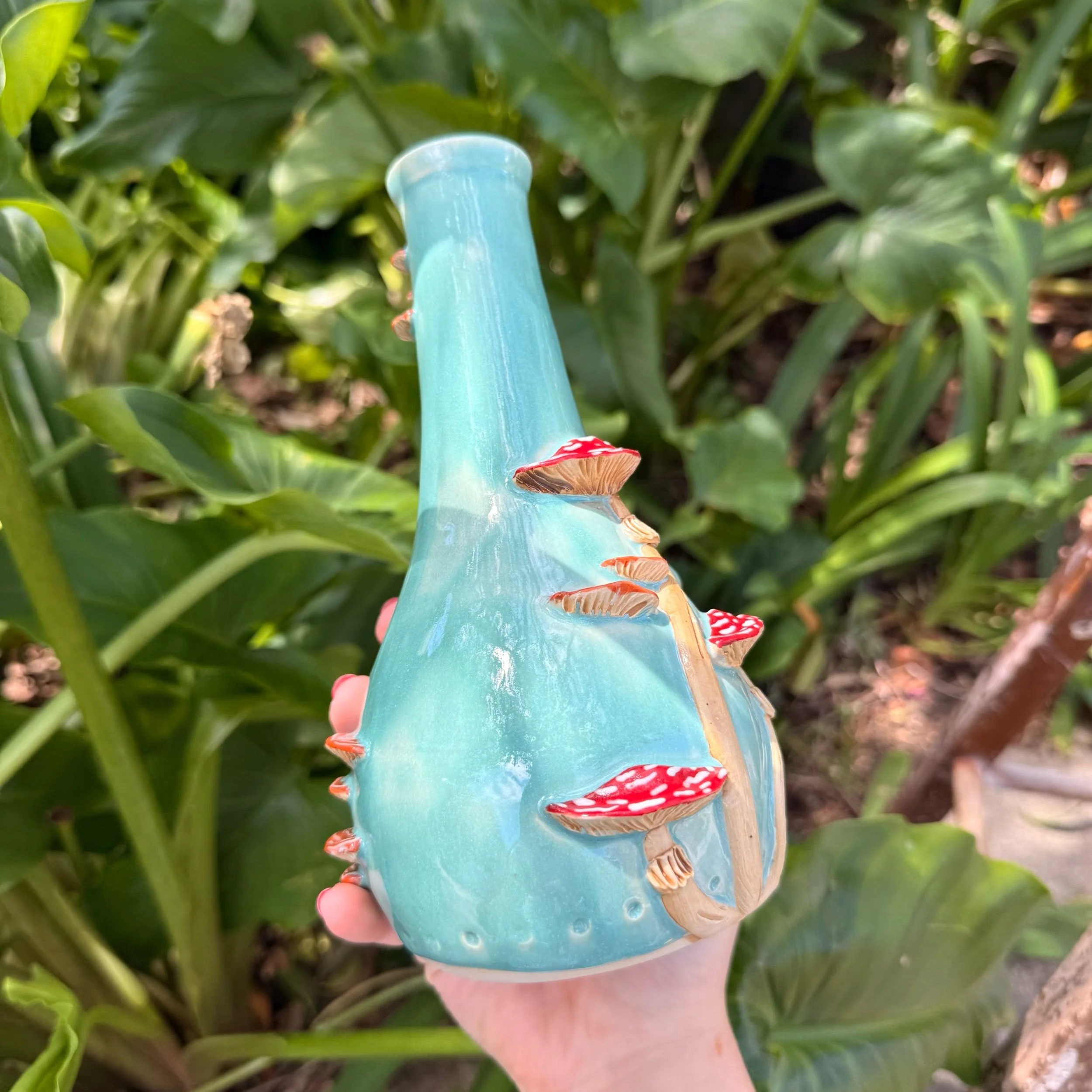 Wheel thrown bubbler with a built in down stem, so you can fill the piece with water, and a carb hole to clear the piece after using. Cleans up well with isopropyl alcohol and salt!