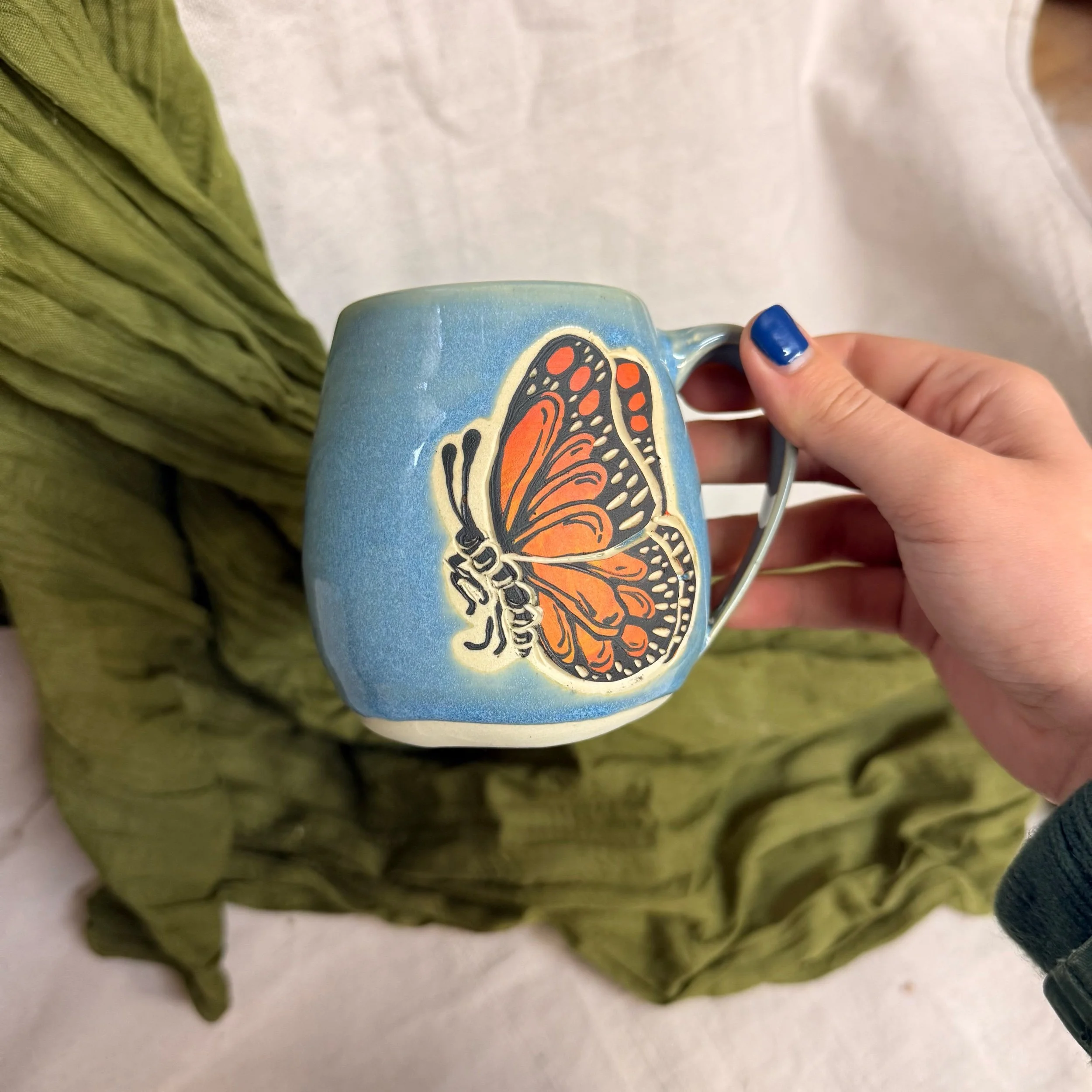 Shop › Flying Monarch Mug Image 1 of 3 Image 2 of 3 Image 3 of 3 Flying Monarch Mug $60.00 sold out! These wheel thrown mugs are hand painted and carved with flying monarchs! Microwave and dishwasher safe. glaze: turquoise blue sold out! Added! These wheel thrown mugs are hand painted and carved with flying monarchs! Microwave and dishwasher safe. Reviews Reviewer Name Review Date Star Rating Description Posted on Etsy Product Show More