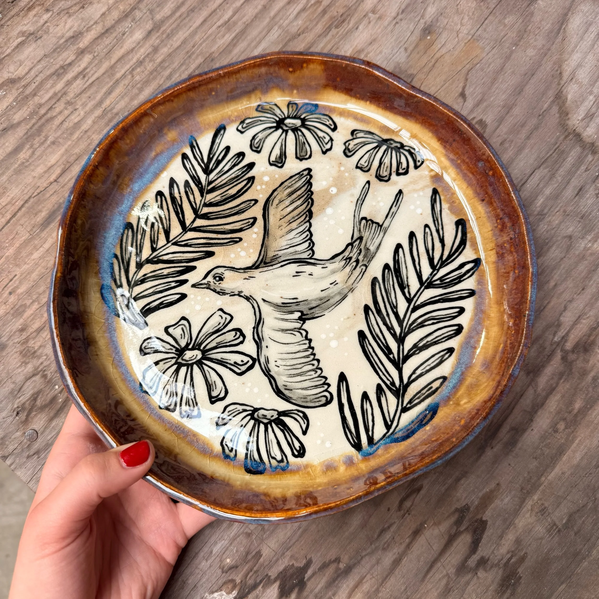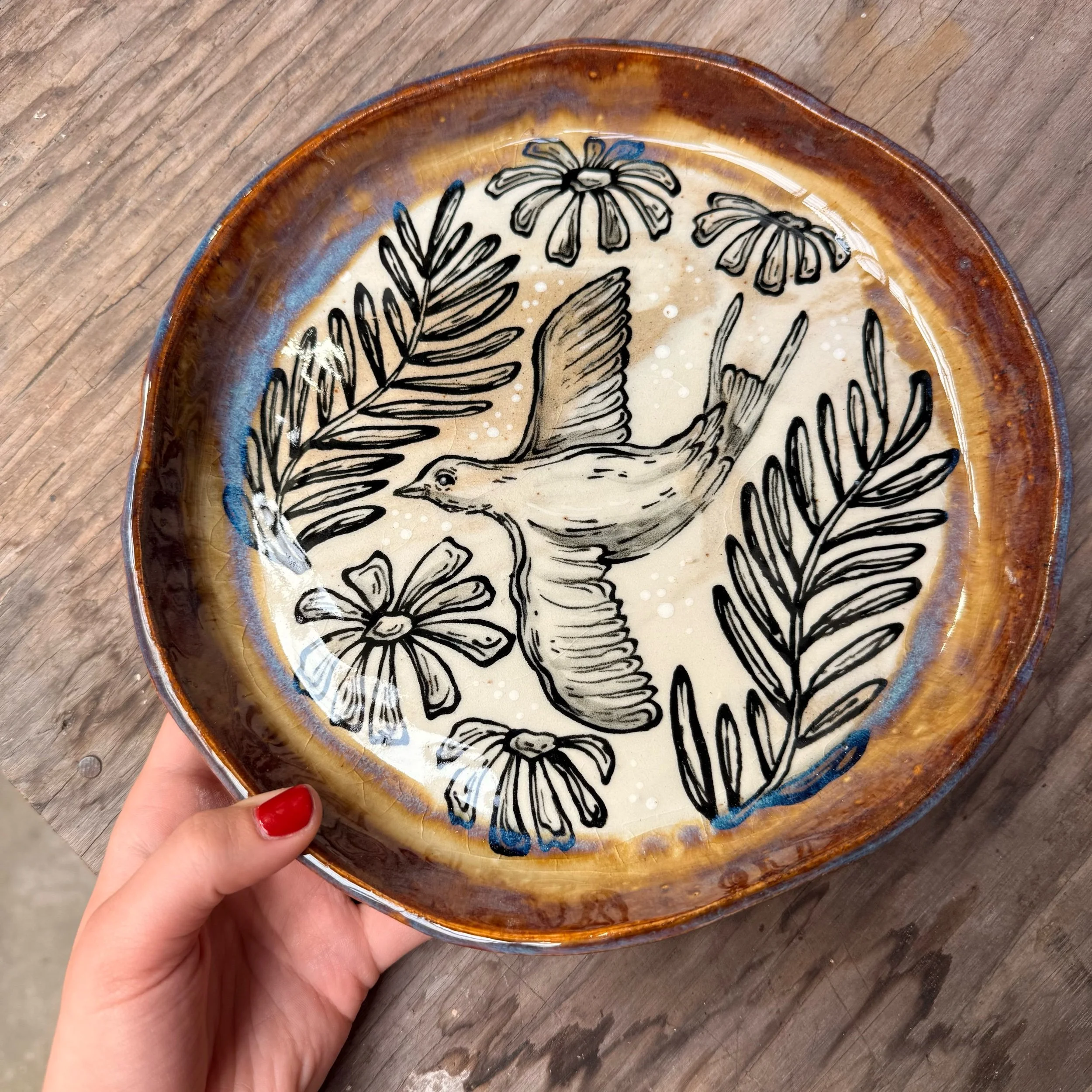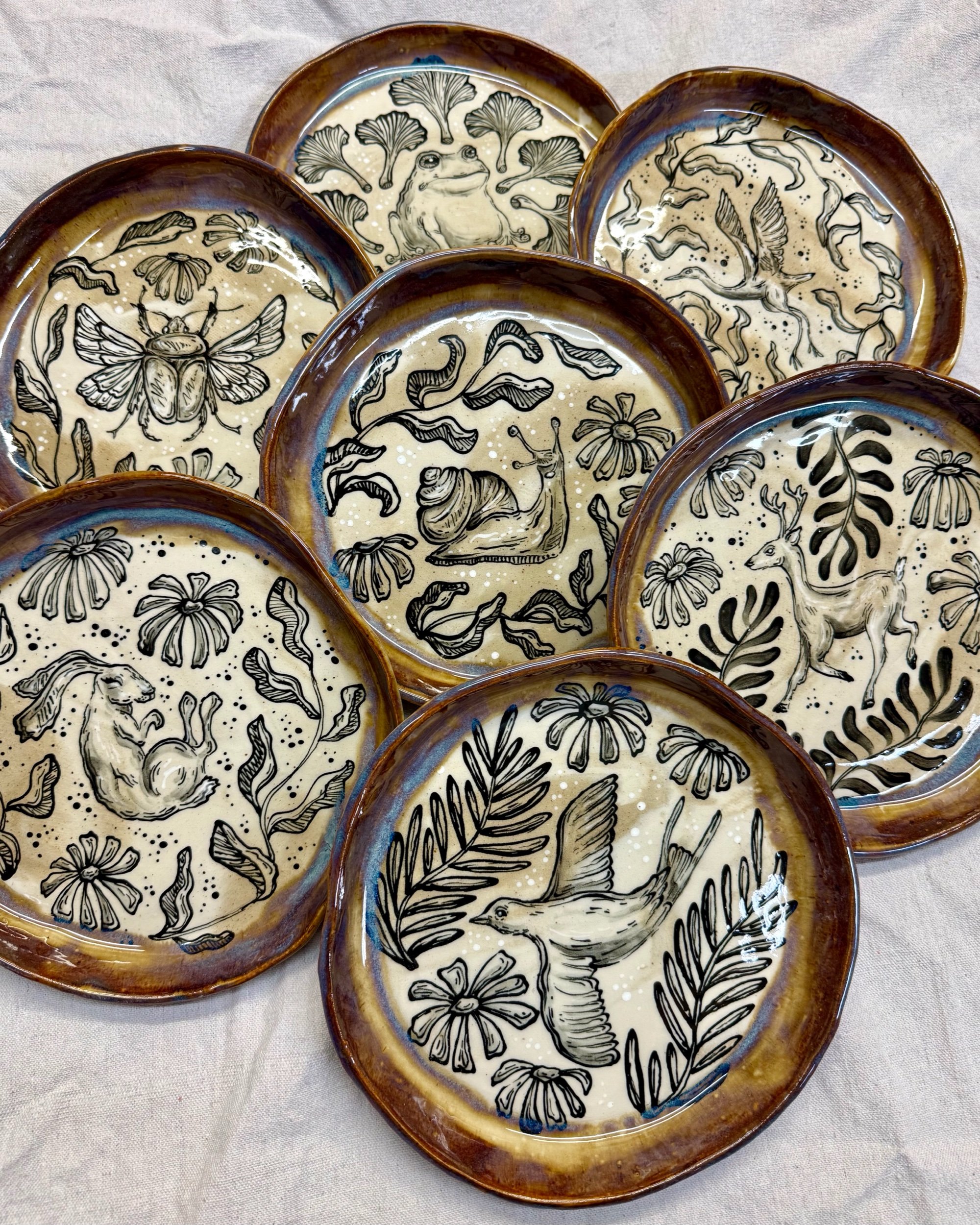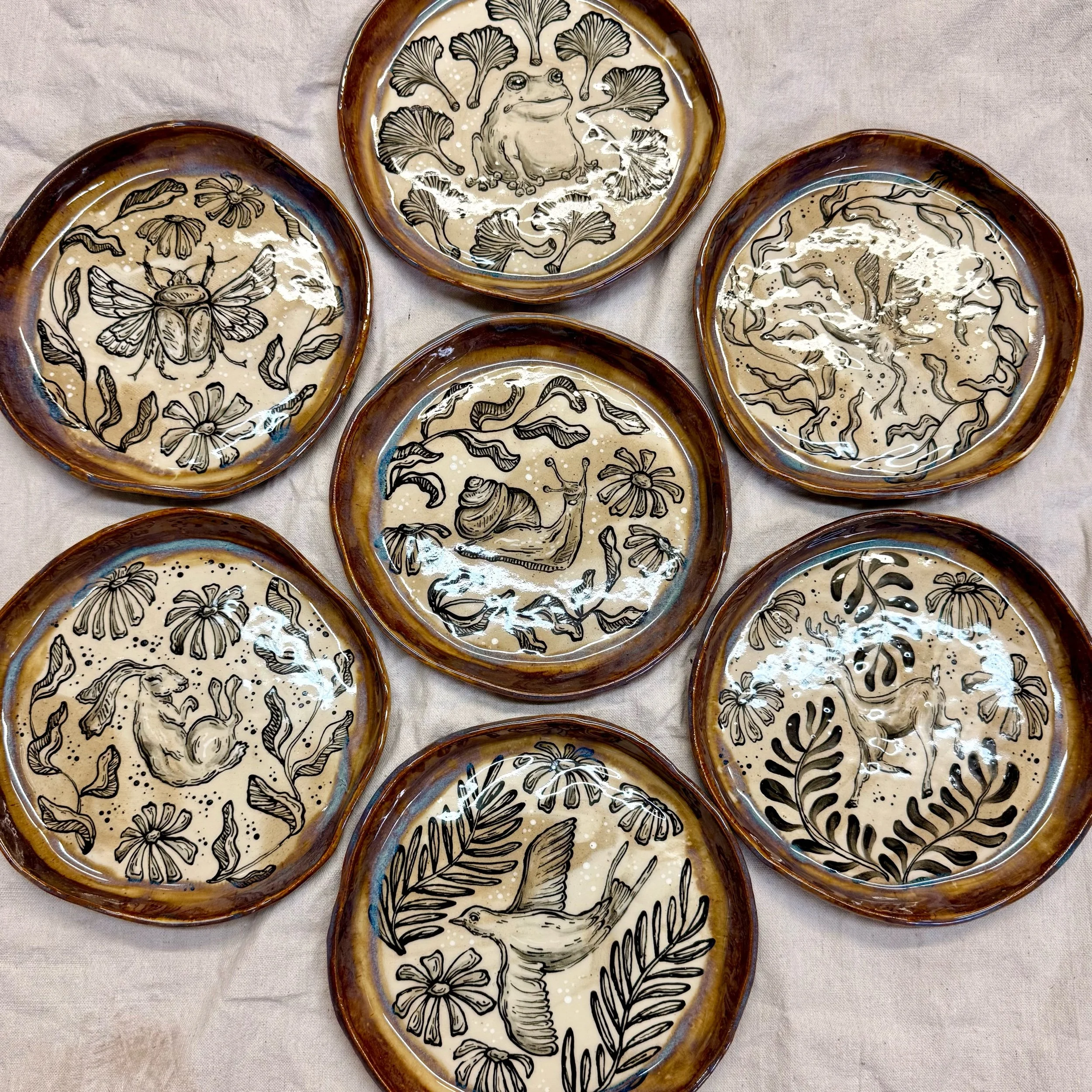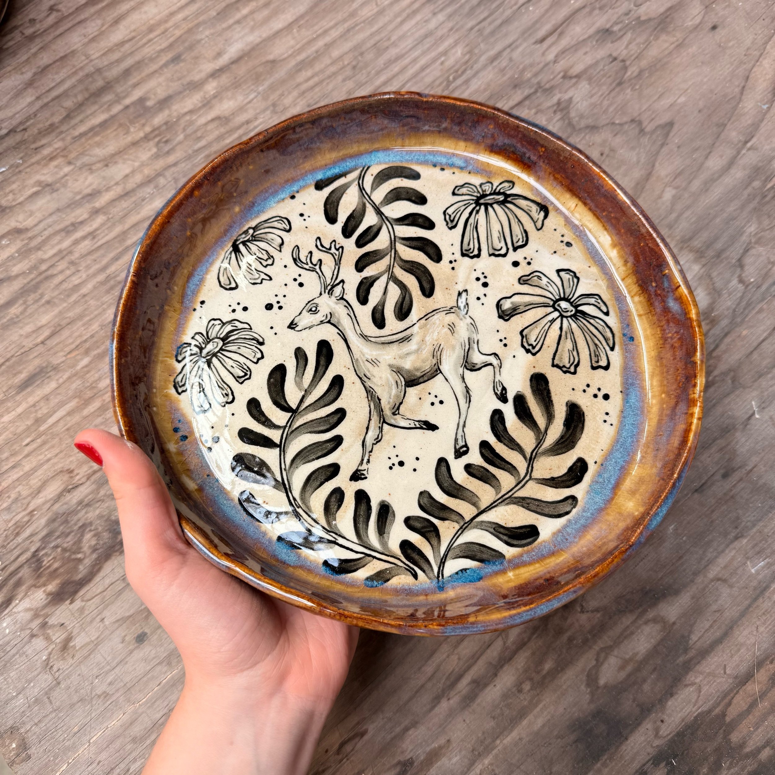 These plates are made from slabs and hand formed, giving them an organic, wavy shape. Each is hand painted with a woodland creature and botanical motif.